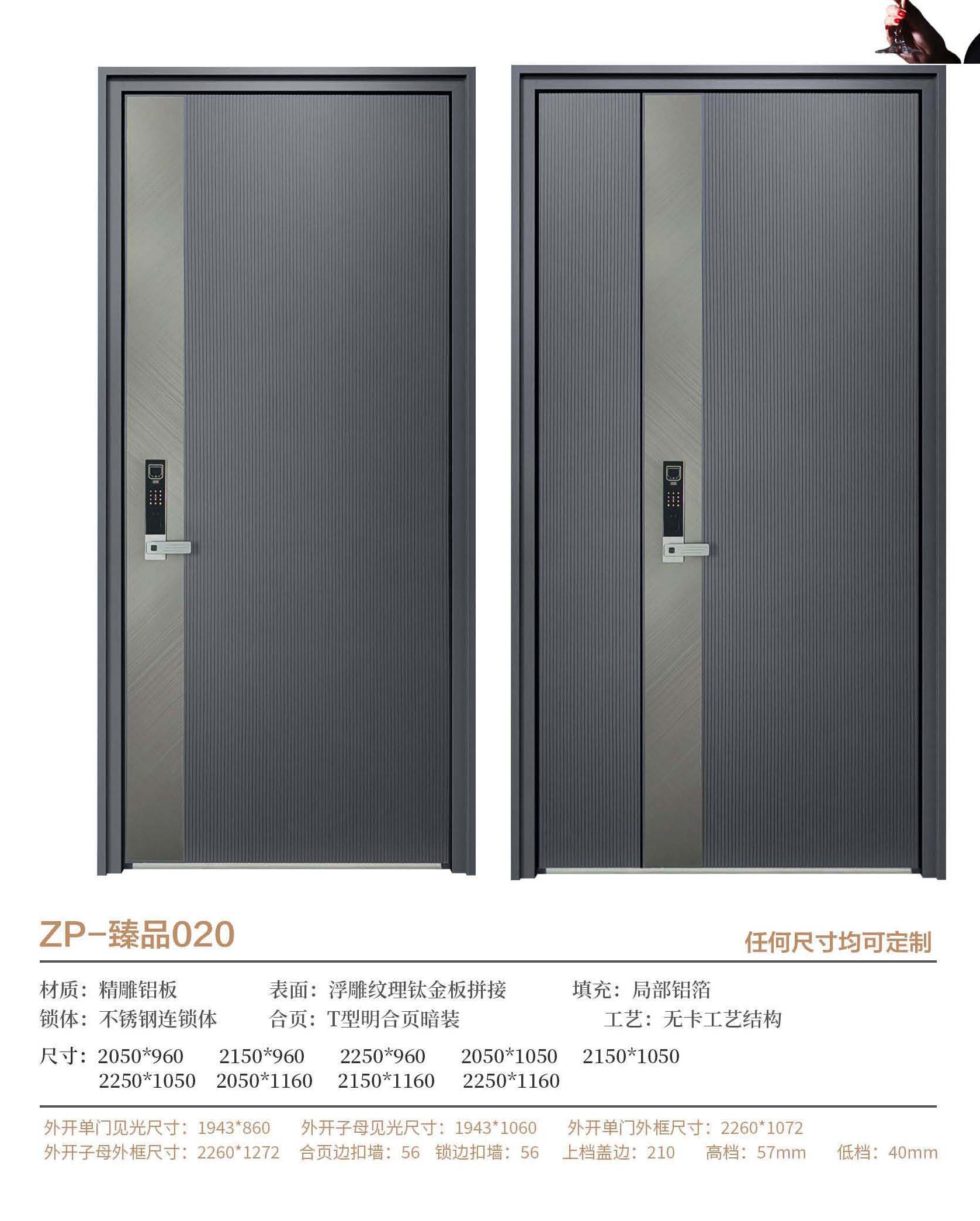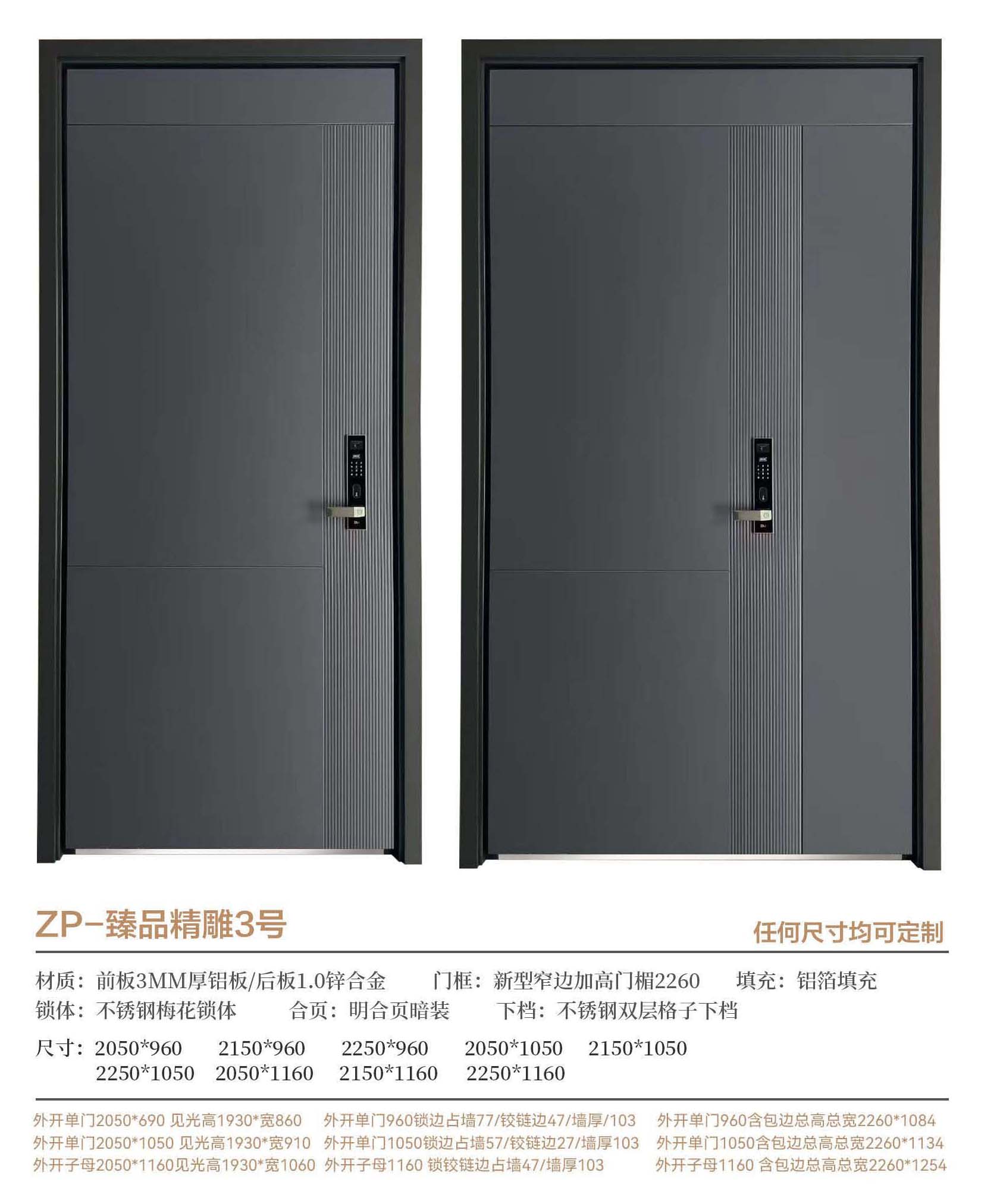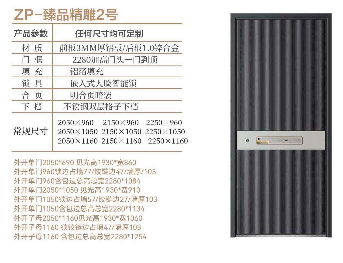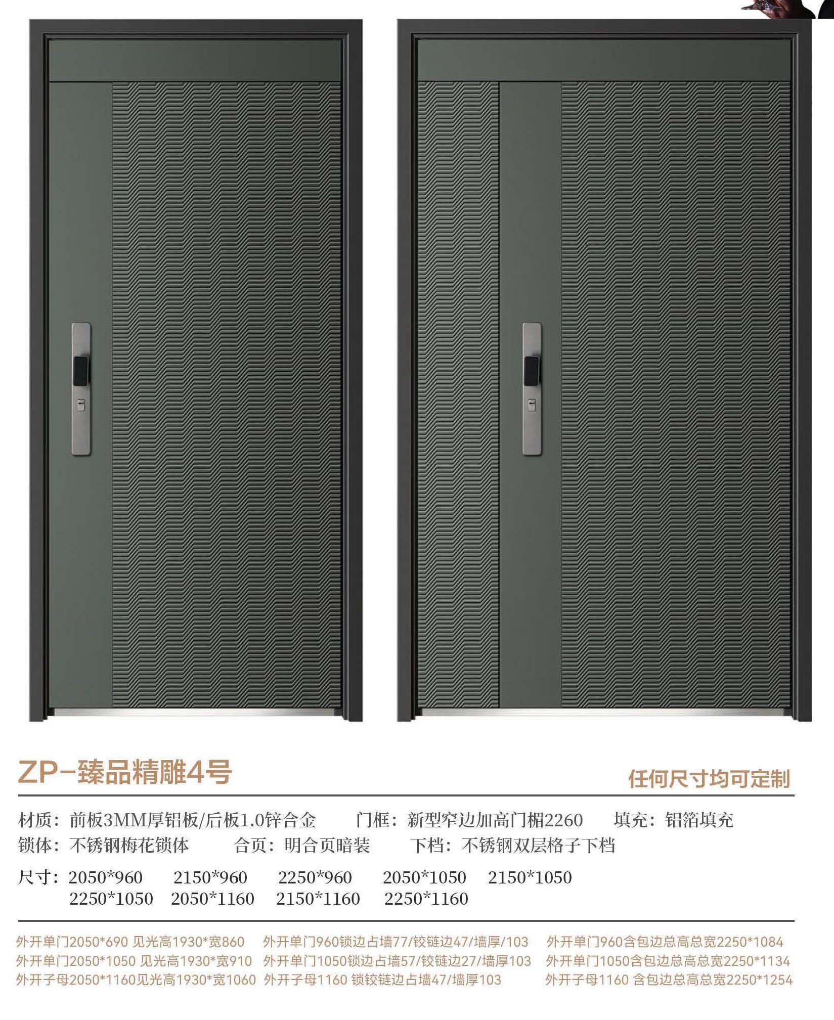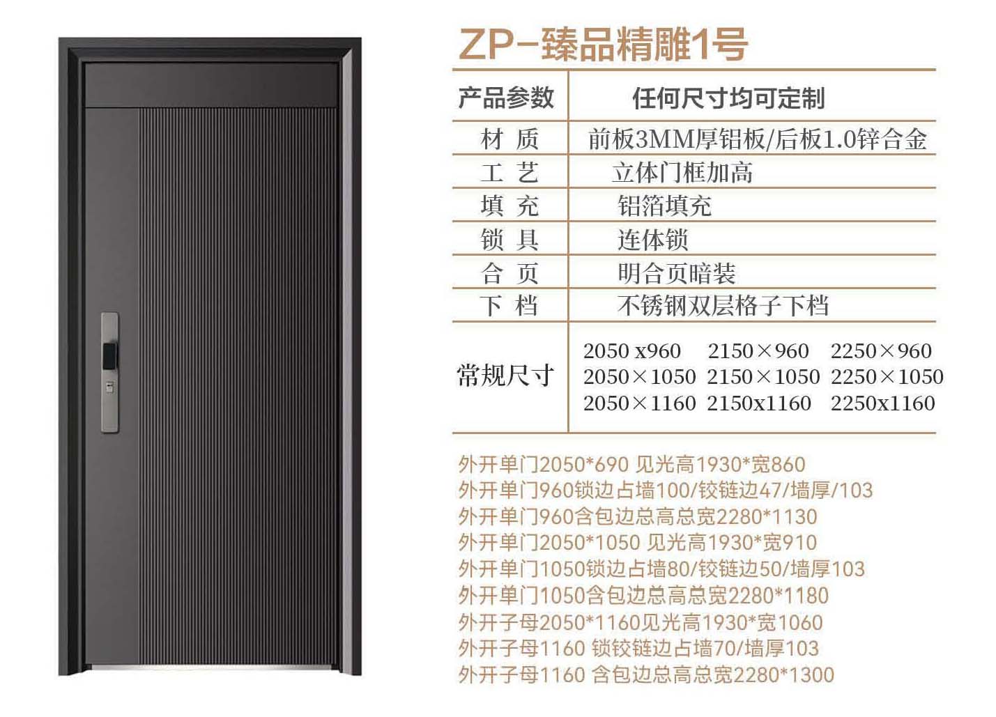 精雕1号到精雕4号 和020为前面板有3MM铝板,在永川包运输,包安装的价格为2980元。其它为锌合金甲级防盗门。特惠款为永川包运输 包安装、1380元。
