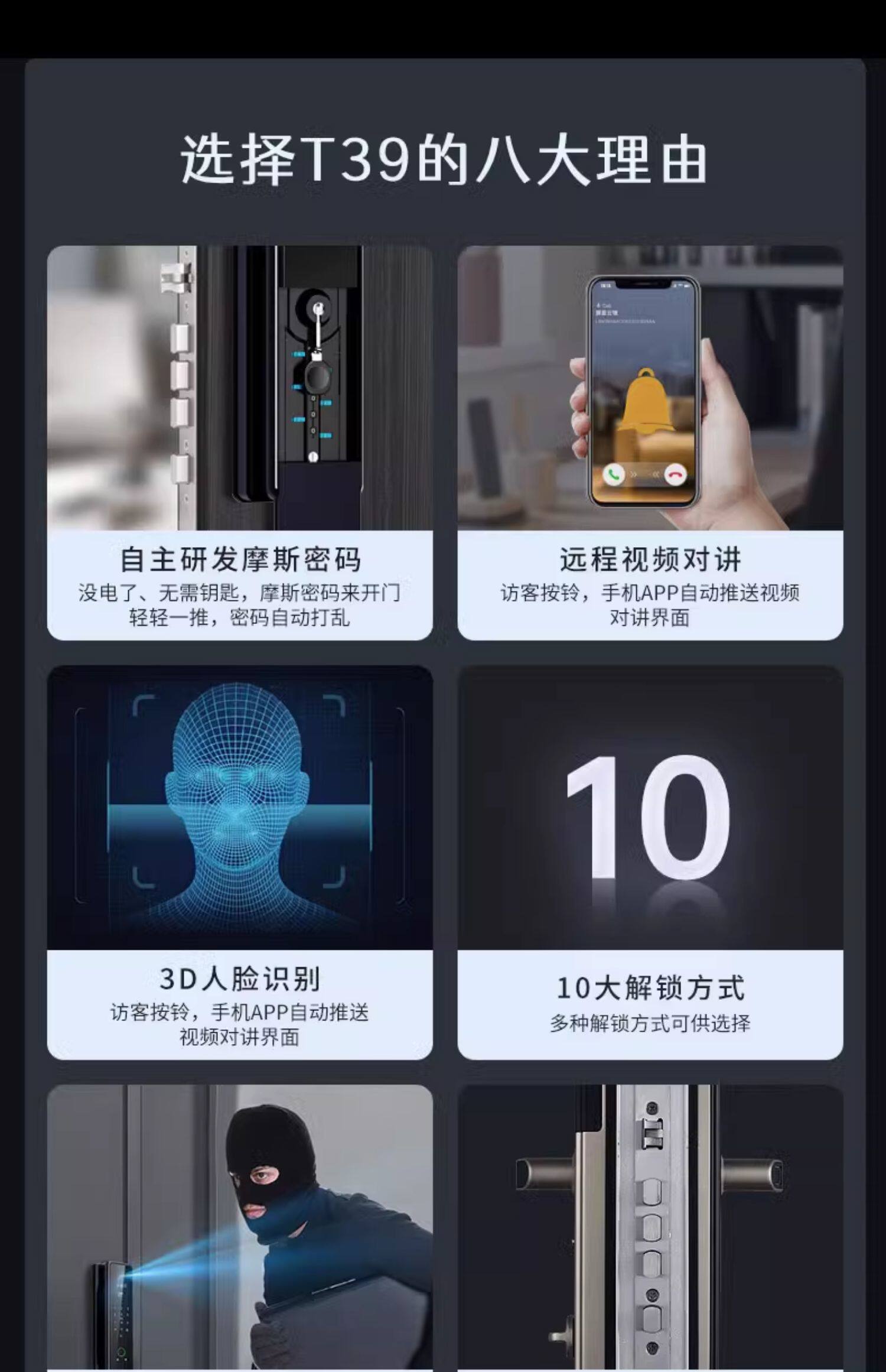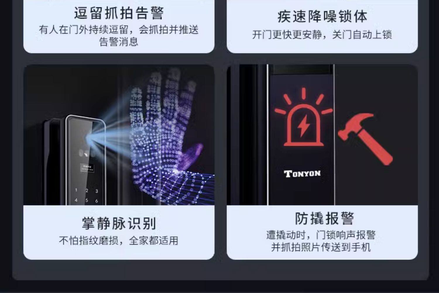 品牌 TONYON 型号 T39 产地 中国大陆 省份 浙江省 地市 温州市 面板及执手材质 铝合金 智能类型 叮叮智能 电源类型 锂电池 数据存储类型 在线 智能家居生态系统 叮叮智能 电子类型 静脉识别 人脸识别 磁卡锁 指纹锁 感应锁 密码锁 屏幕数量 单屏 饰面颜色 T39咖色 T39灰色